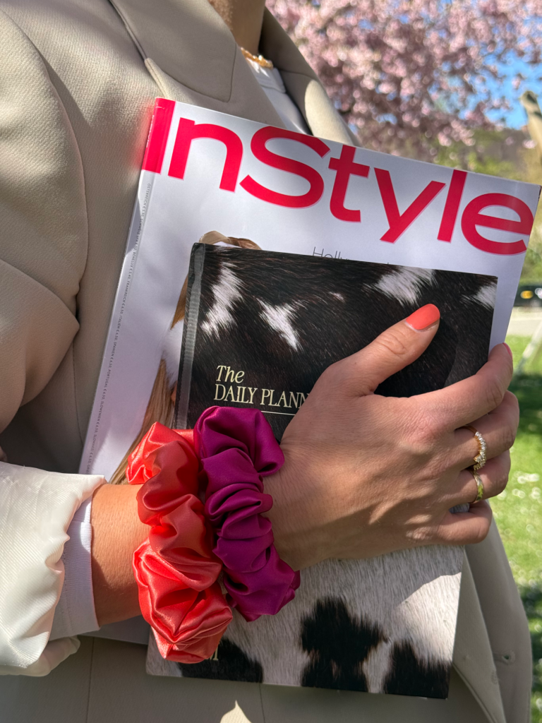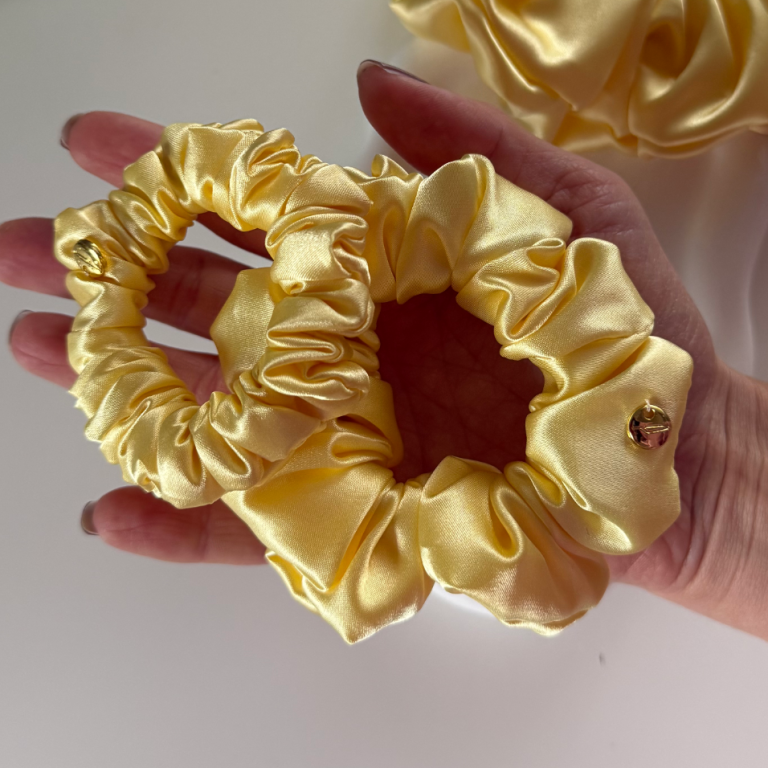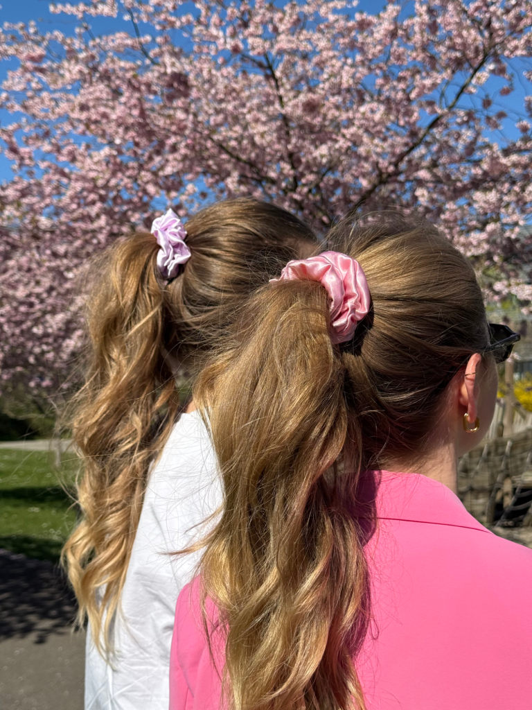 Alle Scrunchies und Haar-Accessoires werden aus hochwertigem Satin oder feiner Seide gefertigt - Stoffe, die aufgrund ihrer glatten Oberfläche gut für deine Haare sind.